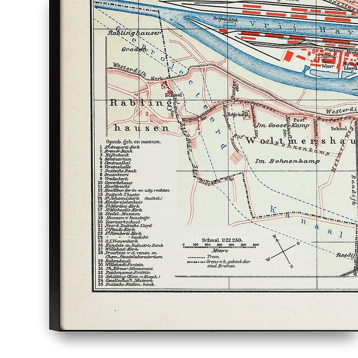 Ein antiker Stadtplan der Stadt Bremen. Diese Karte ist aus der Zeit um 1900 und in Farbe.