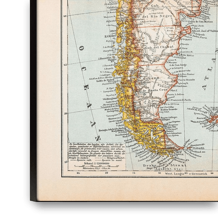 Diese antike Karte aus der Zeit um 1900 zeigt Chile, Patagonien und die La Plata - Staaten (gemeinsame Bezeichnung für Argentinien, Uruguay und Paraguay). Die Karte ist in Farbe.