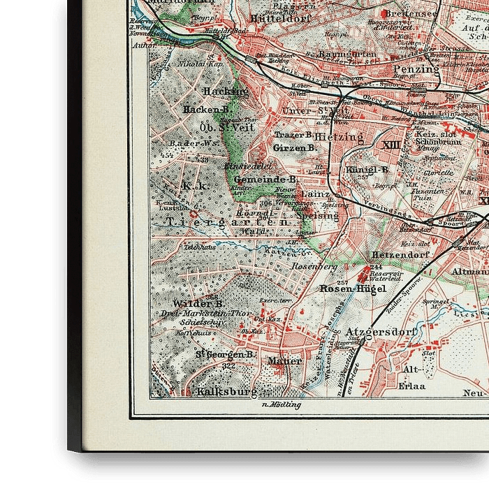 Ein antiker Stadtplan des Stadtgebiets von Wien. Diese Karte ist aus der Zeit um 1900 und in Farbe.