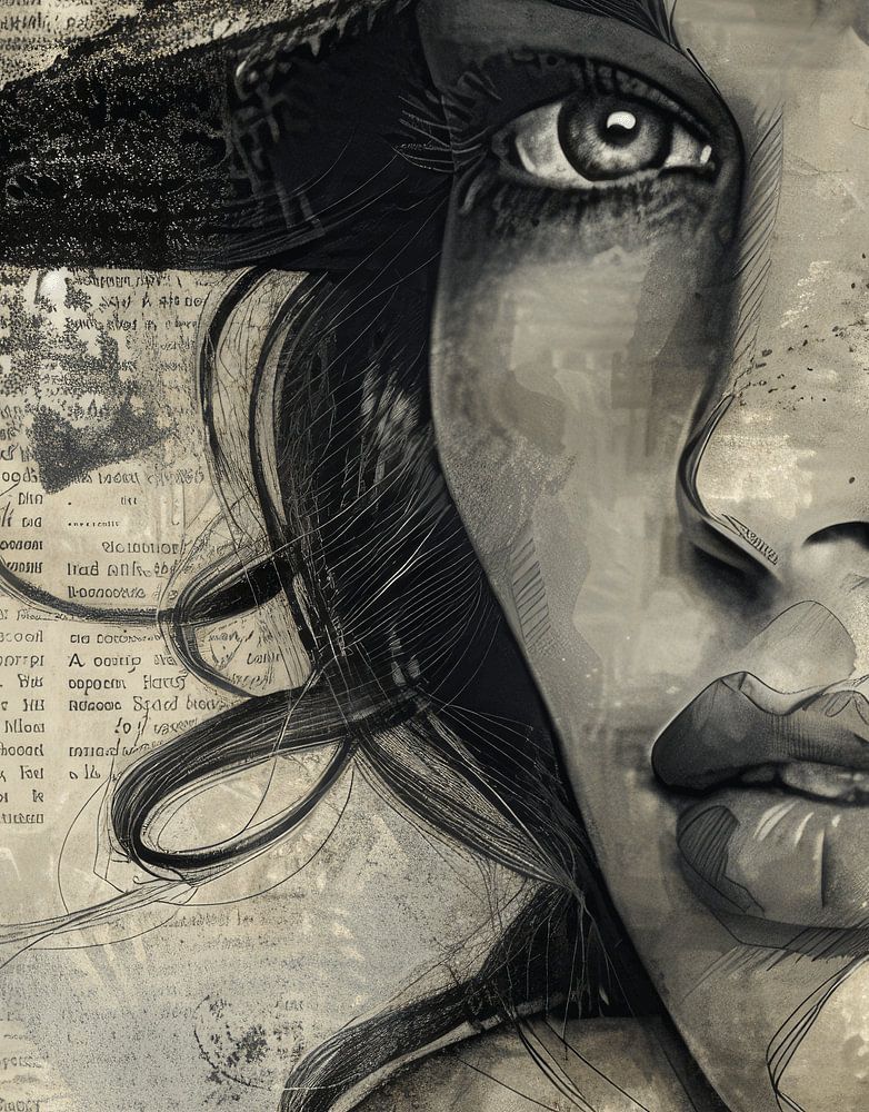 Vintage-Porträt im Mixed-Media-Stil. Ein besonderer Blickfang für Ihr Interieur in Schwarz und Weiß. Wählen Sie das Format und das Material selbst.