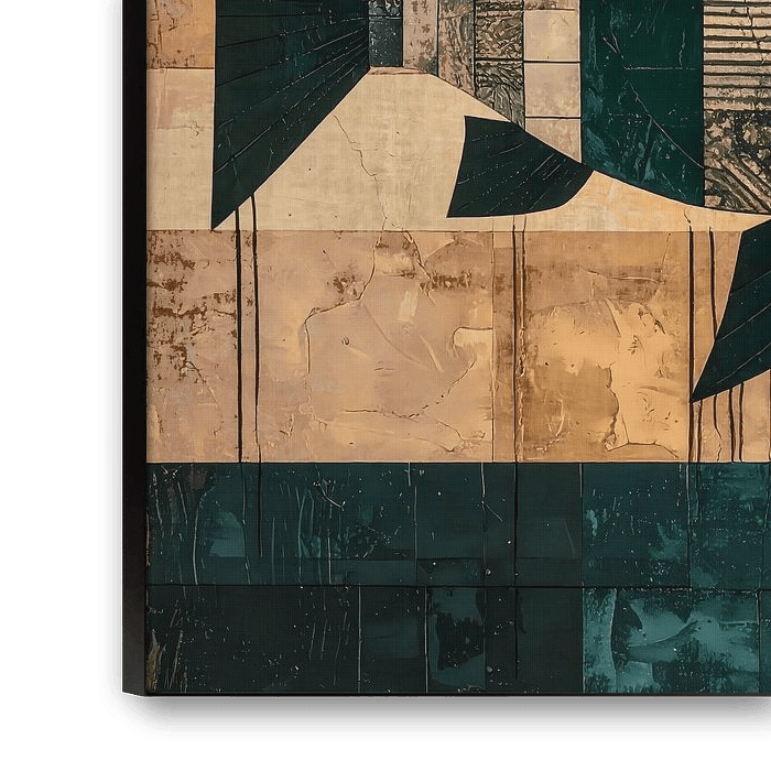 Das Farbschema besteht hauptsächlich aus tiefen blau-grünen, ocker-gelben und beigen Tönen, mit subtilen Anklängen von Braun und verwittertem Gold hier und da. Die Farben sind nicht gleichmäßig, sondern scheinen absichtlich verwittert und geschichtet zu sein, was dem Werk einen Vintage- und Used-Look verleiht.