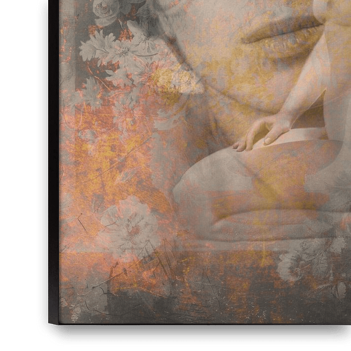 Vintage Reverie - Between Desire and Oblivion ist eine verträumte, mehrschichtige Komposition der bildenden Kunst, in der zwei weibliche Formen mit Blumenmotiven aus einem Meisterwerk des 18.