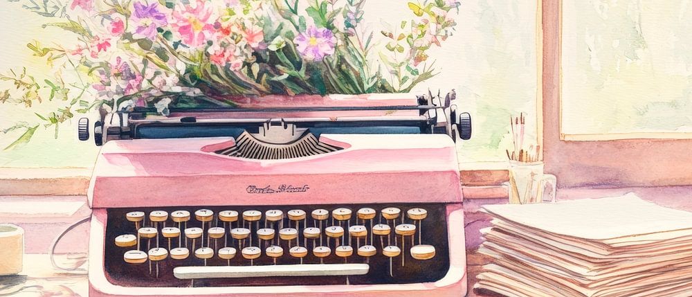 Ein zauberhaftes Zusammenspiel von Nostalgie und Natur entfaltet sich hier: eine antike Schreibmaschine harmoniert perfekt mit einem bunten Blumenarrangement, während sanftes Licht durch die Fenster flutet. Dieses kunstvolle Stillleben verleiht jedem Wohnzimmer eine kreative Note und lädt zu inspirierenden Gedanken und anregenden Gesprächen ein.