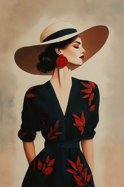 Eine elegante Frau in einem schwarzen Kleid mit auffälligen roten Blattmotiven, dazu ein extravaganter Hut mit breiter Krempe und karmesinrote Ohrringe. Das Kunstwerk verströmt Retro-Glamour – eine nostalgische Hommage an das goldene Zeitalter der Haute Couture – mit einer zeitgenössischen künstlerischen Note. Die raffinierte…