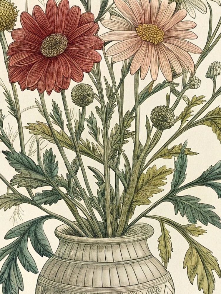 Dieses exquisite digitale Kunstwerk fängt die zeitlose Schönheit einer botanischen Illustration ein und zeigt ein üppiges Arrangement von Astern und Chrysanthemen in verschiedenen Rot-, Rosa- und Weißtönen. Die detailreich dargestellten Blumen werden in einer eleganten, strukturierten Vase präsentiert, die mit einem klassischen Rautenmuster verziert ist. Das zarte Blattwerk und die subtilen Hintergrundelemente unterstreichen die Vintage-Ästhetik und machen dieses Stück zu einer perfekten Mischung aus natürlicher Schönheit und künstlerischer Handwerkskunst. Diese Illustration ist ideal, um jedem Raum einen Hauch von klassischer Eleganz und heiterem Charme zu verleihen. Sie weckt ein Gefühl von Nostalgie und den bleibenden Reiz traditioneller botanischer Kunst.