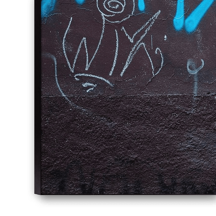 Zentrale Fensterläden in Violett treffen auf eine Wand voller Tags, überzogen von einer schwungvollen türkisen Linie. Haptische Holzstruktur, Patina und Lackspuren verleihen Tiefe—ein grafisches Urban‑Stillleben für Industrial‑, Modern‑ und eklektische Räume.