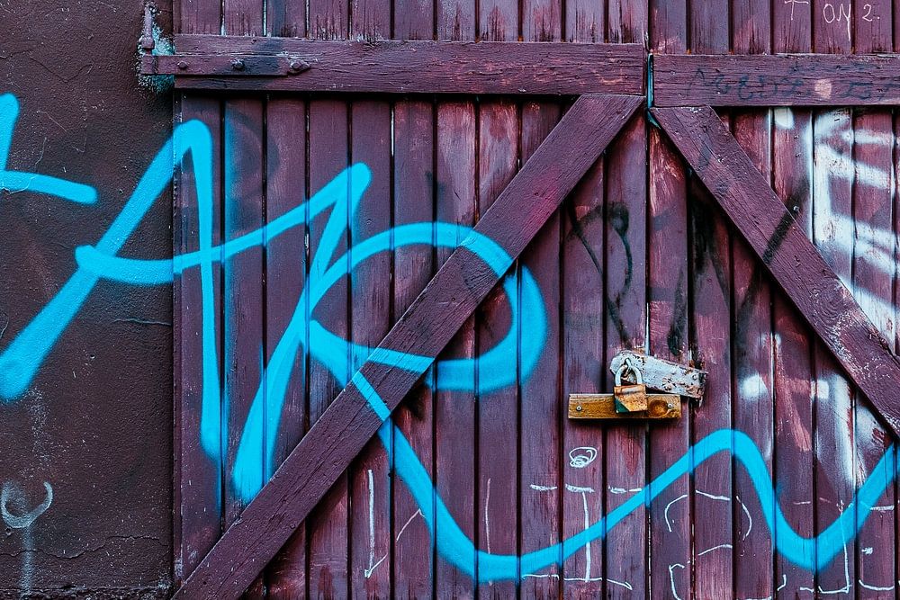 Violette Holz‑Fensterläden mit Vorhängeschloss vor getaggter Wand; dynamische türkisfarbene Sprühlinie. Markante Street‑Art‑Fotografie für Loft oder Büro.