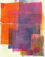 Bestelle dieses abstrakte Wandbild Violette Quadrate auf orange von Karen Kaspar als Reproduktion auf Leinwand, Alu-Dibond, als Poster, Fototapete oder Acrylglasbild.