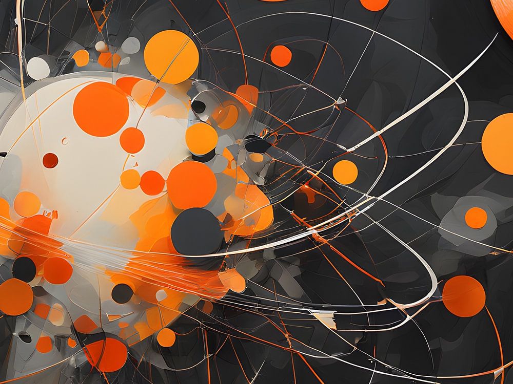 Dieses Kunstwerk verbindet Elemente abstrakter und futuristischer Kunstbewegungen mit einem spielerischen Umgang mit geometrischen Formen und Farben. Die Komposition zeigt ein dynamisches Zusammenspiel von Orange-, Weiß- und Grautönen, in denen sich Kreise und Linien überschneiden und überlagern und so ein Gefühl von Bewegung und Energie erzeugen. Die komplexen Muster und Schichten laden den Betrachter dazu ein, jedes Mal neue Details zu entdecken.