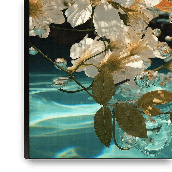 Weiße Blüten, die einem Obstbaum entlehnt zu sein scheinen, schwimmen zusammen mit reifen Orangen auf der klaren Wasseroberfläche. Die Szene ist unter einer strahlenden Sonne eingefangen, die die…