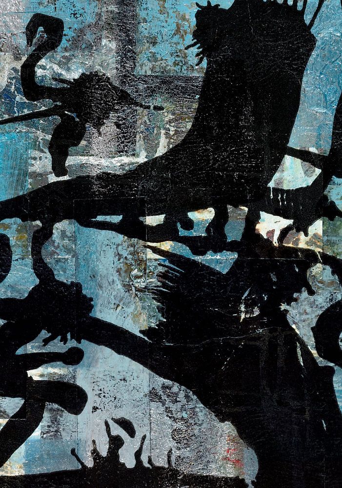 Das abstrakte Bild zeigt gedruckte schwarze Farbspuren auf lebhaftem Untergrund