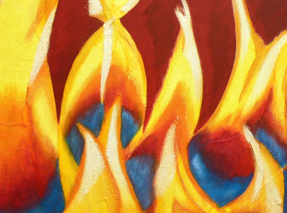 Warm en vurige afbeelding van een vlammenzee, een openhaardvuur met warme kleuren. Het origineel is ook te koop en heeft interessante details omdat de vlammen gemaakt zijn van stof dus het schilderij bevat relief.