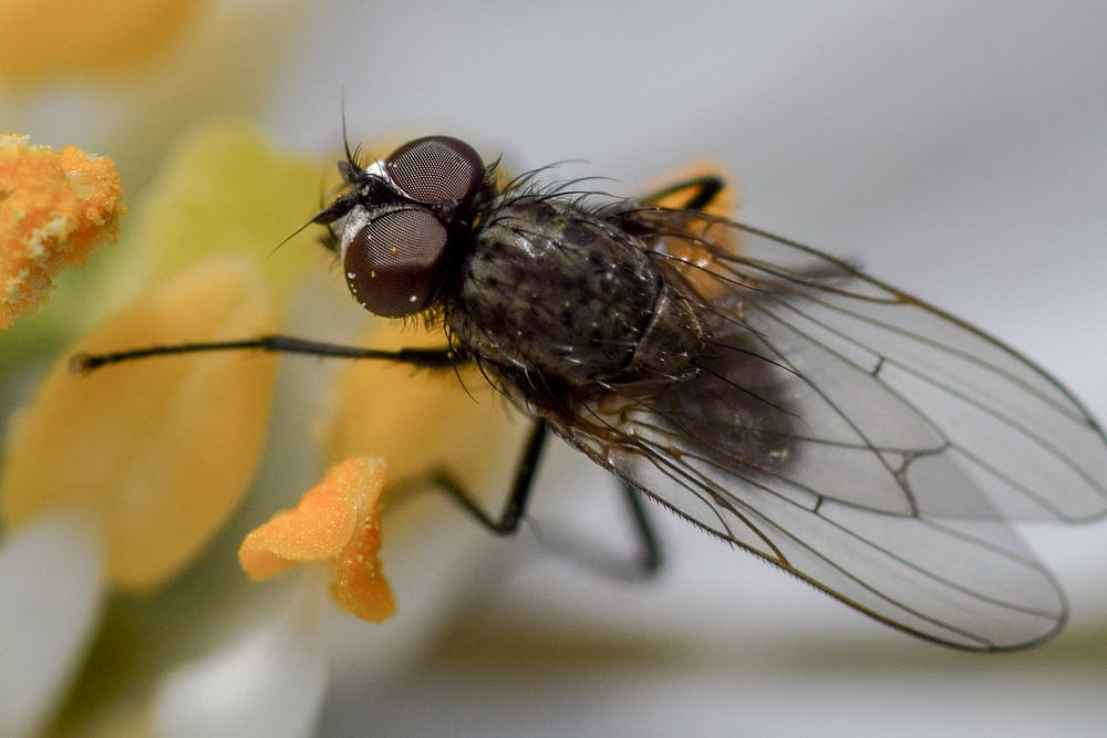 Macro foto van een huisvlieg op een witte lelie