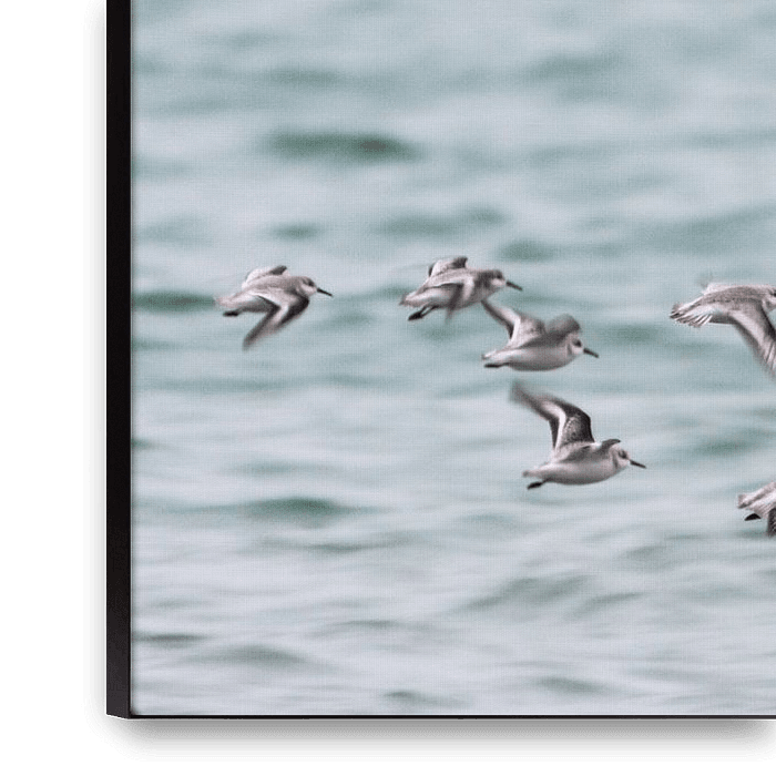 Groepje strandlopers boven de Oosterschelde, de Zeelandbrug maakt herkenning van het gebied mogelijk.