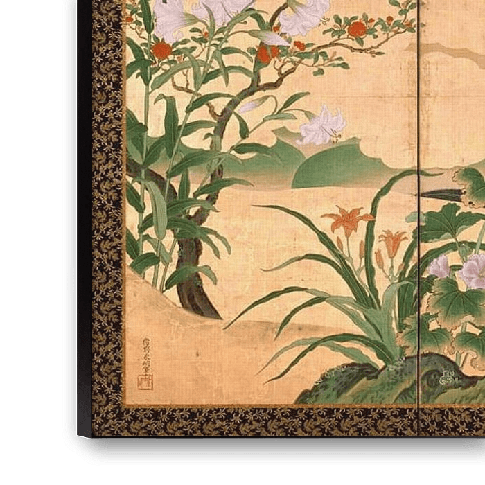 Die Komposition des rechten Bildschirms konzentriert sich auf eine Kirschbaumweide, mit Nachtigallen und Fasanen, die in der Szene verstreut sind. Der linke Bildschirm zeigt eine Kiefer, die von Glyzinien umrankt ist, mit schwarzen Paradiesschnäppern und rötlichen Turteltauben, die das Sommerbild vervollständigen. Der lebendige Bach, der durch die Szene fließt, ist als weißer Wasserlauf dargestellt, was der Gesamtkomposition eine kühle Sensibilität verleiht. Die Komposition steht vor einem Goldgrund und wird durch goldene Wolken hervorgehoben. Diese Kombination von Gold mit üppig gefärbten saisonalen Vögeln und Blumen war Teil des Repertoires der Kano-Schule an Bildern mit Vögeln und Blumen der vier Jahreszeiten.