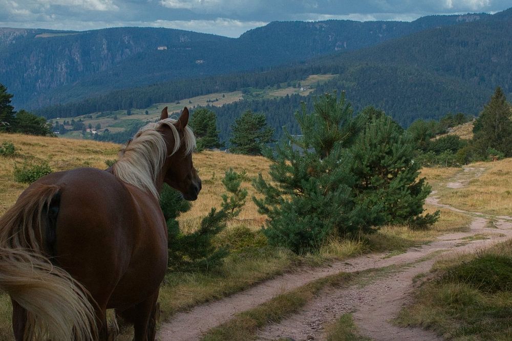 Einsames Pferd auf dem Hohrodberg in den Vogesen in Frankreich