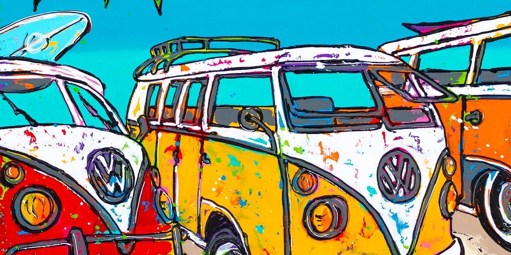 Drei alte VW-Busse am Strand von der Künstlerin Renate Rolefes. Das Originalbild ist 140 x 70 groß und mit Acrylfarbe gemalt.