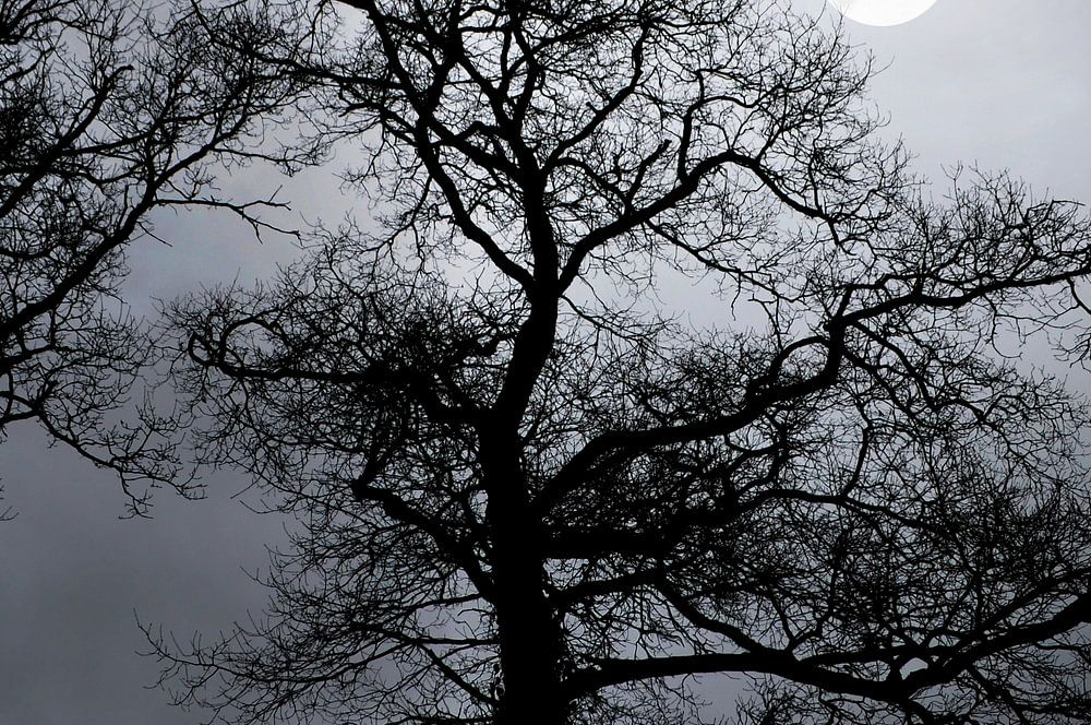 Eine stimmungsvolle Aufnahme des Vollmonds, der durch eine dünne Wolkendecke über einer alten Eiche zu sehen ist. Da es Nacht ist, sind die Bäume nicht mehr als Silhouetten am Nachthimmel.