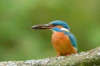 Dieser Eisvogel hatte einen schönen kleinen Fisch für sein Junges gefangen. Zu sehen, weil der Kopf des Fisches außerhalb des Schnabels des Eisvogels liegt.