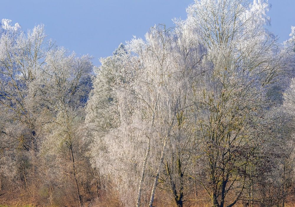 Vom Raureif überzogenen Bäume in einer Winterlandschaft bei Schrobenhausen