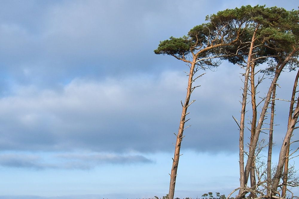 Vom Wind geformte Bäume am Strand der Ostsee. Wolken am Himmel, Strandabschnitt mit Dünen.