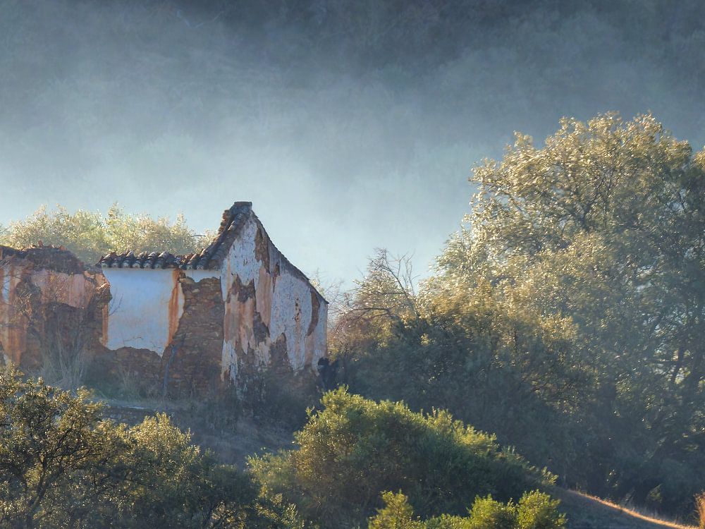 Diese verlassene Hütte taucht früh am Morgen aus dem Nebel auf. Die tief stehende Morgensonne vertreibt langsam den Nebel, der die Berge und Hügel einhüllt. Das warme Licht streichelt die Wipfel der Bäume.
