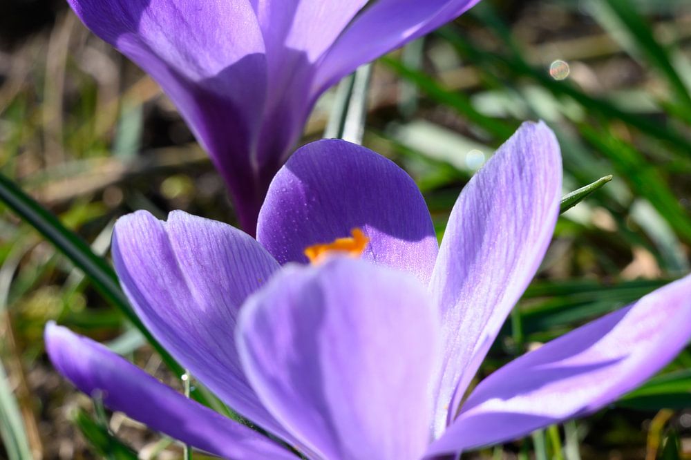 Voorjaarsbloeier in de zon tussen het gras. de paarse kleur staat vrolijk in de kamer.
