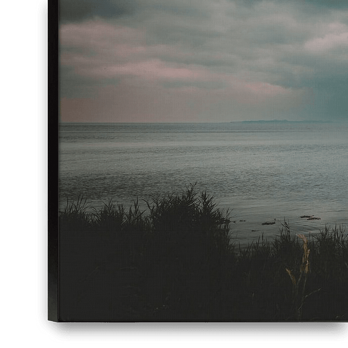 Eine ruhige, minimalistische Landschaftsaufnahme mit weitem Blick über die Ostsee. Dichte Wolken ziehen auf und tauchen Himmel und See in gedämpfte, kühle Farben. Das Bild fängt die besondere Stimmung kurz vor dem Regen ein – still, weit und voller Tiefe. Ideal für eine reduzierte, atmosphärische Raumgestaltung.