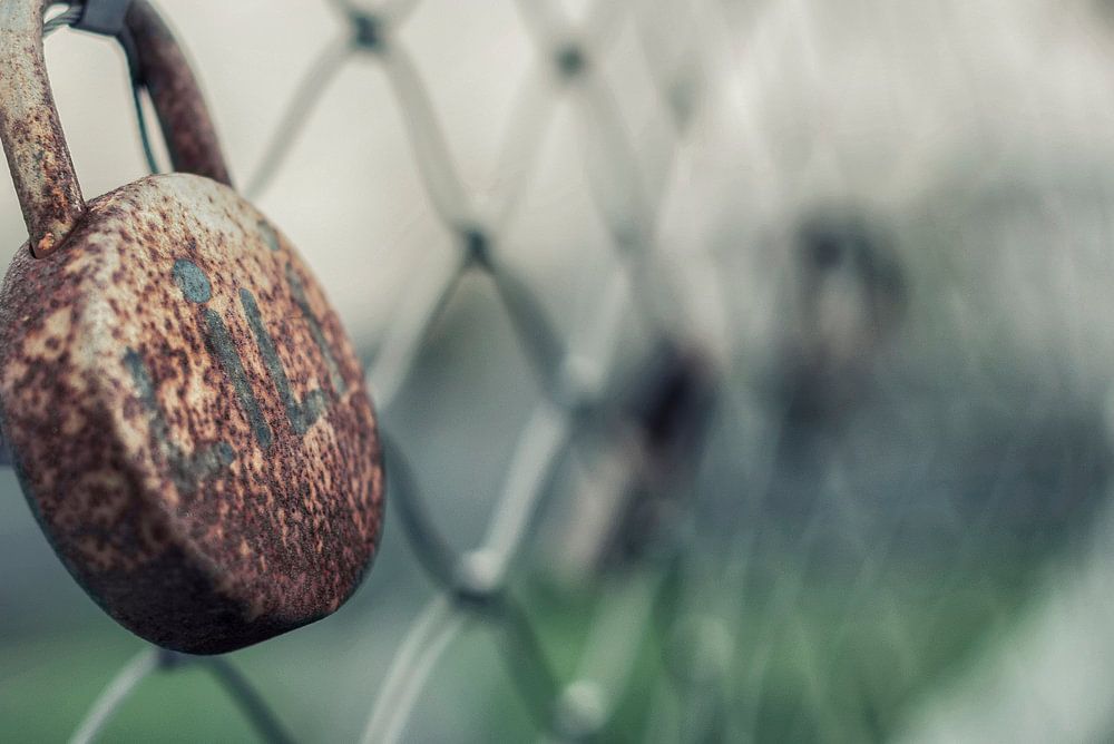 Ein einsames Vorhängeschloss hängt über der Rad- und Fußgängerbrücke der Collegebrug in Kortrijk