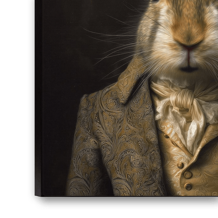 Die Bildkomposition ist meisterhaft durchdacht: Der dunkle, atmosphärische Hintergrund mit seinen grünlichen Schattierungen lässt das Motiv kraftvoll hervortreten. Die aufrecht stehenden Ohren des Hasen verleihen ihm eine würdevolle Haltung, während die detailreiche Darstellung jeder einzelnen Fellstruktur beeindruckt. Die ornamentale Stickerei des Anzugs mit ihren geschwungenen Mustern und goldenen Akzenten unterstreicht die aristokratische Ausstrahlung. --Der Hase selbst verkörpert Intelligenz und Eleganz - seine natürliche Anmut wird durch die formelle Kleidung noch verstärkt. Diese surreale Verbindung schafft ein einzigartiges Kunstwerk voller Charme und Persönlichkeit.