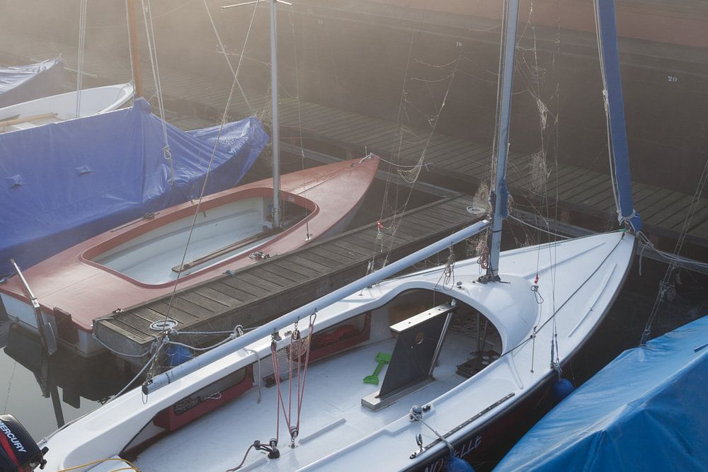 Haven bij de Gravenbol bij Wijk bij Duurstede met open zeilbootjes op een mistige morgen wachtend op de bemanning