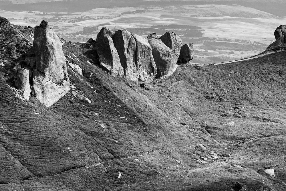 Wunderschöne Landschaftsansicht mit Blick auf die markanten Felsformationen des Puy Gros in der Nähe von Super Besse, das zum Sancy-Massiv in der Region Vulkane der Auvergne in Zentralfrankreich gehört. Sommerliche Aussicht mit schönem, flüchtigem Licht, das Schatten auf die Berge wirft.