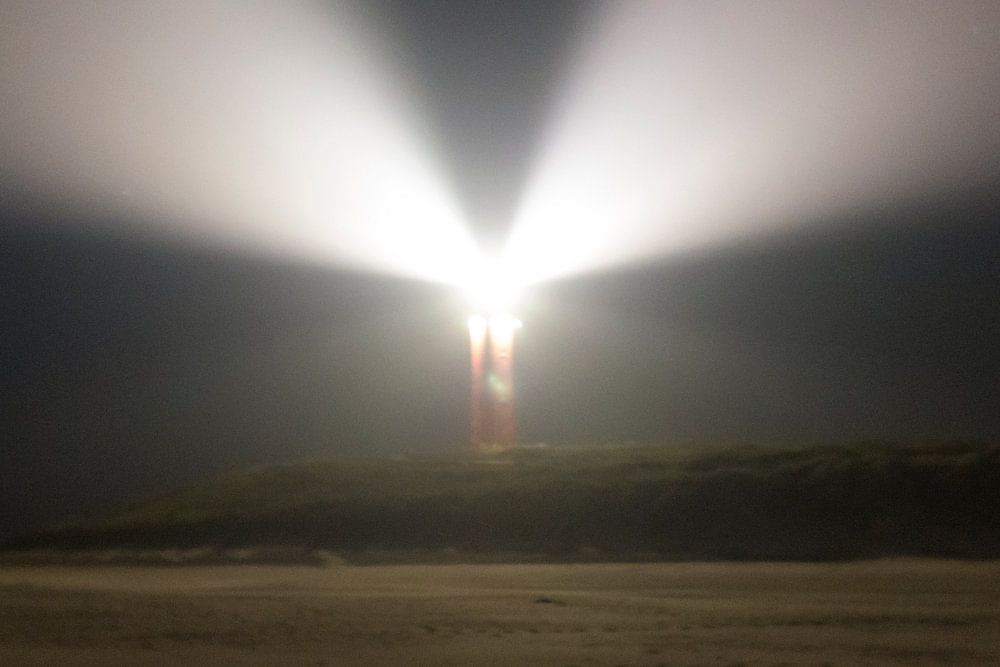De vuurtoren van Texel in de donkere en nachtelijke uren. Iedere keer als de lichtstraal passeert wordt je verblind door het heldere licht en zie je daarna even niets meer. Spookachtig?