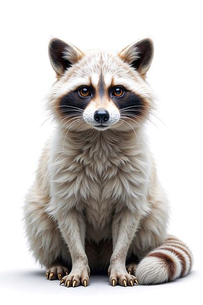In ruhiger, würdevoller Haltung sitzt der Waschbär im Zentrum der Komposition, eingebettet in eine makellose, lichtdurchflutete Klarheit. Sein dichtes, fein strukturiertes Fell wirkt wie sorgfältig geformt, jede einzelne Faser sichtbar und von sanfter Helligkeit durchzogen. Die charakteristische Gesichtszeichnung tritt in perfekter…