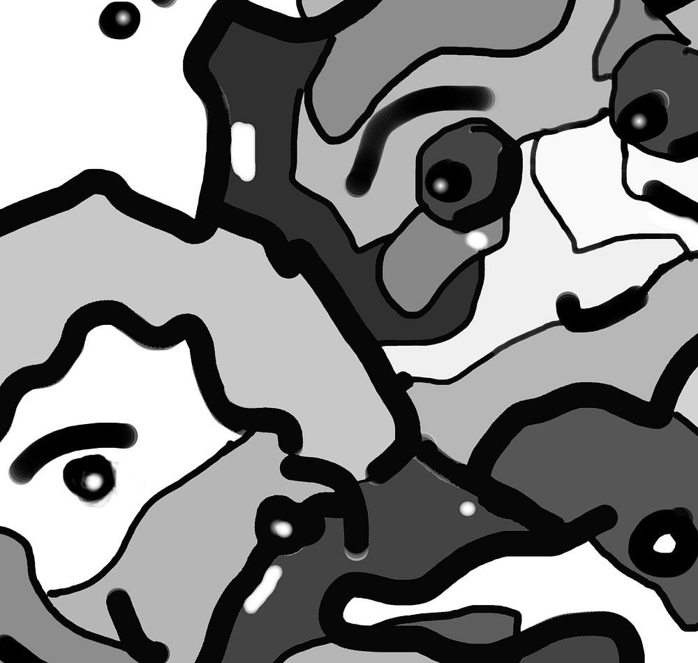 Werk in zwart-wit waar het naast de karakteristieke lijnen ook gaat om het grafisch effect. De compositie en de vlakverdeling is prettig voor het oog en is ook geschikt voor afdruk op groter formaat. Eentonige kleurvlakken. Een clowneske scène. Carnavalesk.