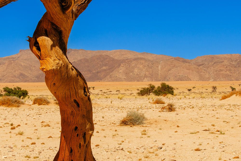 In der endlosen Weite der namibischen Wüste, wo Himmel und Erde nur durch den Horizont voneinander getrennt sind, steht ein einzelner Baum – karg, verdreht, ausgedörrt – und dennoch voller Ausdruck. Dieses Bild zeigt ihn inmitten eines offenen Sand- und Geröllfeldes, der Blick reicht weit über flache Hügel hinweg in eine Landschaft, die rau und ehrlich ist. Es ist eine Szene, die von Leere erzählt – und von Stärke.