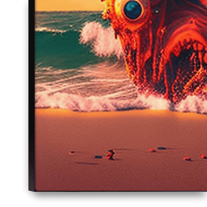 Wächter der Gezeiten präsentiert eine surreale und fesselnde Küstenlandschaft, in der ein riesiges, lebensechtes Auge aus einer organischen, farbenfrohen Struktur herausblickt, die sich aus den Wellen des Ozeans erhebt. Der lebhafte Himmel und der weiche Sandstrand bilden einen dramatischen Kontrast zu dem surrealen Mittelpunkt und…