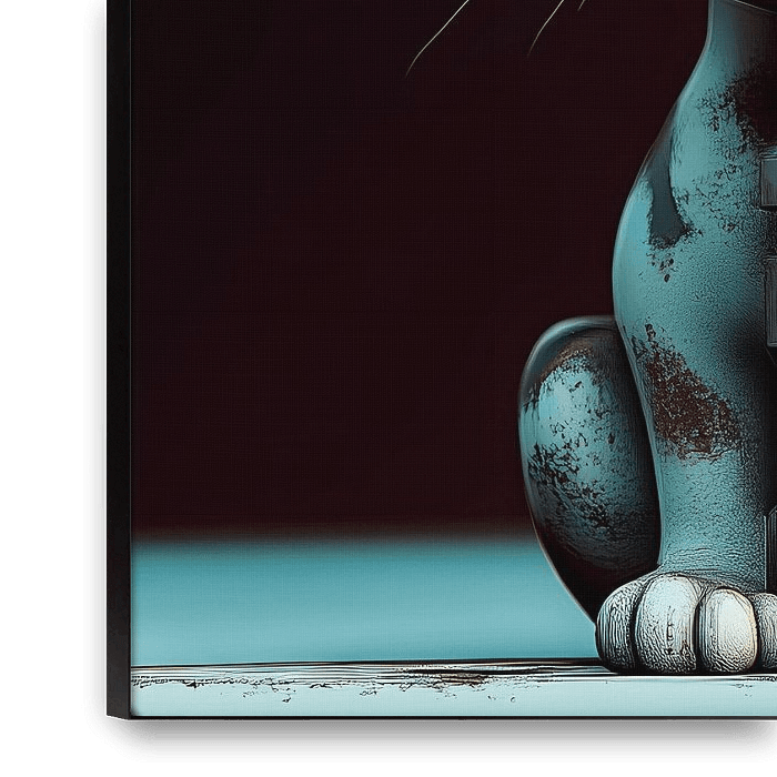 Mit ihren übergroßen bernsteinfarbenen Augen, in denen sich unbekannte Welten spiegeln, ist diese mechanische Katze sowohl ein Relikt als auch ein Wächter einer vergessenen Zukunft. Ihr verrosteter, von der Zeit verwitterter Metallkörper verschmilzt nahtlos mit organischen Merkmalen und schafft ein Wesen zwischen Maschine und…