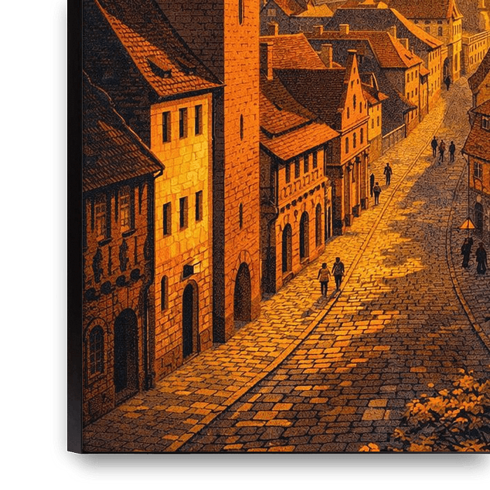 poetischer Blick auf eine historische europäische Altstadt, in der das warme Licht des Sonnenuntergangs durch die kopfsteingepflasterten Straßen und mittelalterlichen Dächer fließt. Im Vordergrund steht eine monumentale Statue mit einer astronomischen Kugel als stille Wächterin der Zeit, des Wissens und der menschlichen…