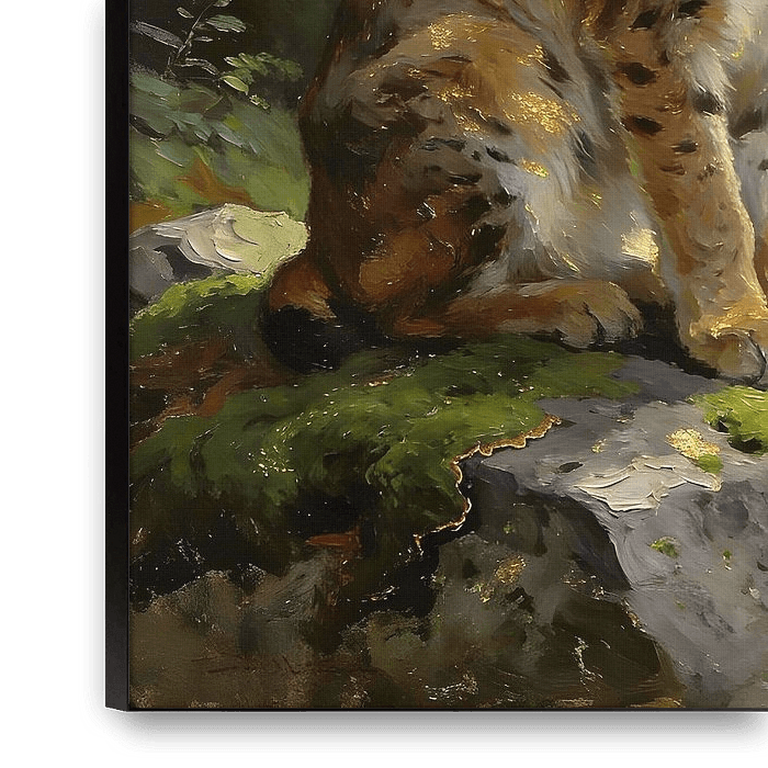 Guardian of the Harz zeigt einen Moment stiller Beobachtung tief in den Wäldern des Harzes. Ein Eurasischer Luchs ruht ruhig auf einem moosbedeckten Felsen, umgeben von schichtigen Wäldern und sanftem Licht. Das Tier wird nicht in Bewegung oder Anspannung gezeigt, sondern in Stille – wachsam, ausgeglichen und in sich gekehrt.