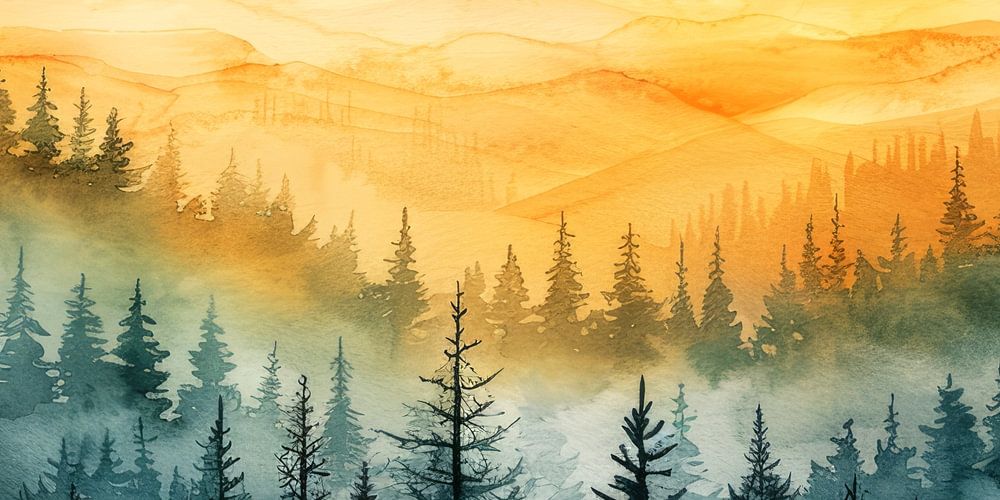Dieses ruhige, kraftvolle Kunstwerk zeigt eine atemberaubende Aquarelllandschaft, die die geheimnisvolle und beruhigende Essenz eines Waldes bei Sonnenaufgang oder Sonnenuntergang einfängt.