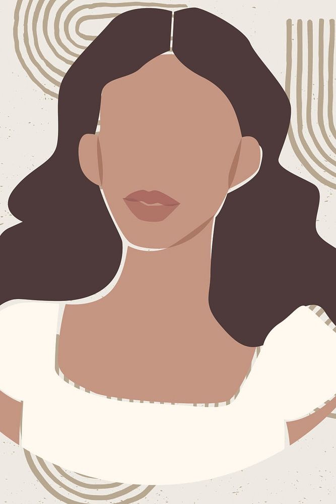 Dieses abstrakte Gemälde zeigt eine weibliche Figur vor einem beige gemusterten Hintergrund.