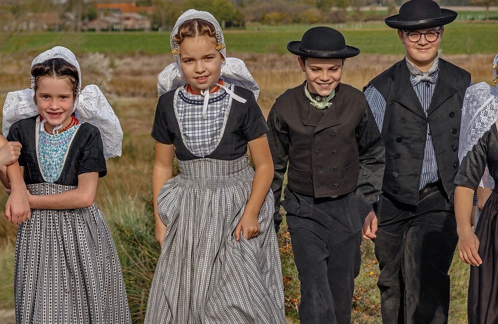 Kinder in Walcheren-Tracht in den Dünen bei Vlissingen Die Walcheren-Tracht ist eine bekannte regionale Tracht in Zeeland, die auf der Insel Walcheren getragen wird.
