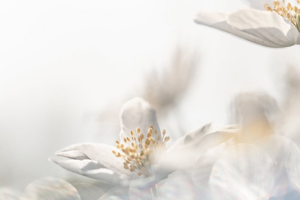 Bestelle dieses abstrakte Wandbild Waldanemonen mit Bokeh von Patricia van Kuik als Reproduktion auf Leinwand, Alu-Dibond, als Poster, Fototapete oder Acrylglasbild.