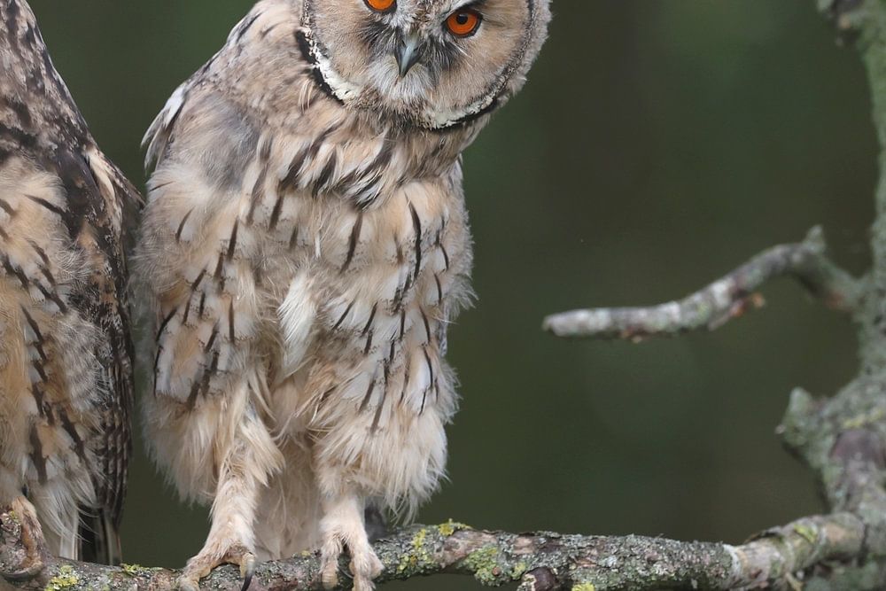 Zwei Waldohreulen auf einem Ast. Die Waldohreule ist eine relativ große Eule, die in ganz Europa mit Ausnahme von Island vorkommt. Wie die meisten Eulen ist auch die Waldohreule vor allem nachts aktiv. Diese Eule jagt Nagetiere und rastende Vögel. Die Waldohreule ist in bewaldeten Gebieten mit Nadelbäumen und auf offenen Feldern zu finden. Im Winter halten sich die Waldohreulen gerne in der Gesellschaft anderer Vögel auf.