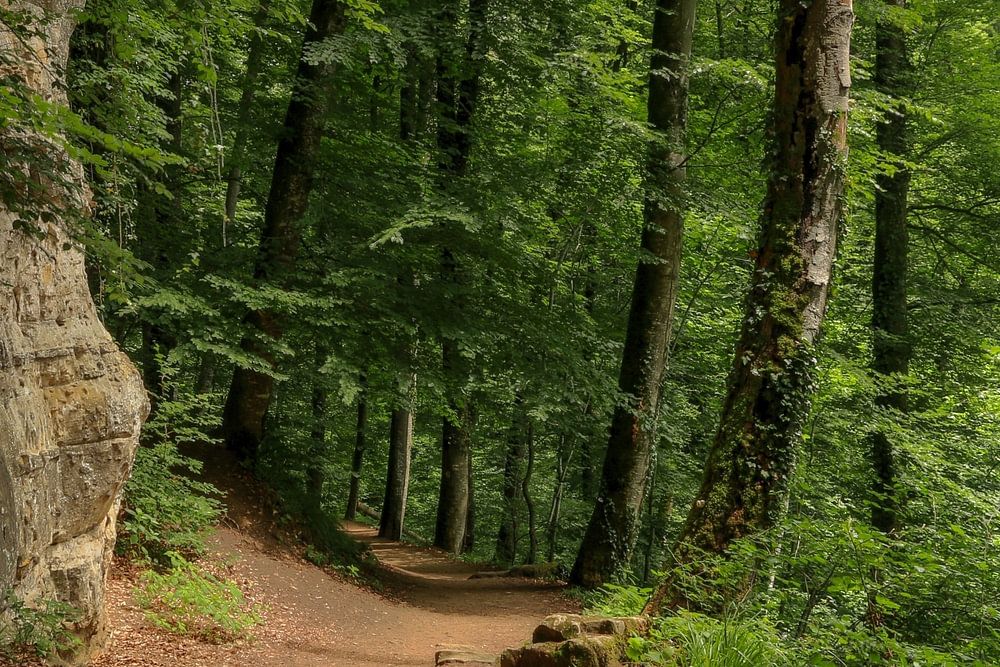 Der Waldweg schlängelt sich entlang eines Felsvorsprungs.