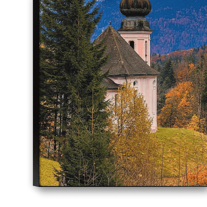 Das Licht im Tal schafft eine ruhige und stimmungsvolle Alpenlandschaft, die die Harmonie von Natur, Glauben und bayerischer Tradition widerspiegelt.