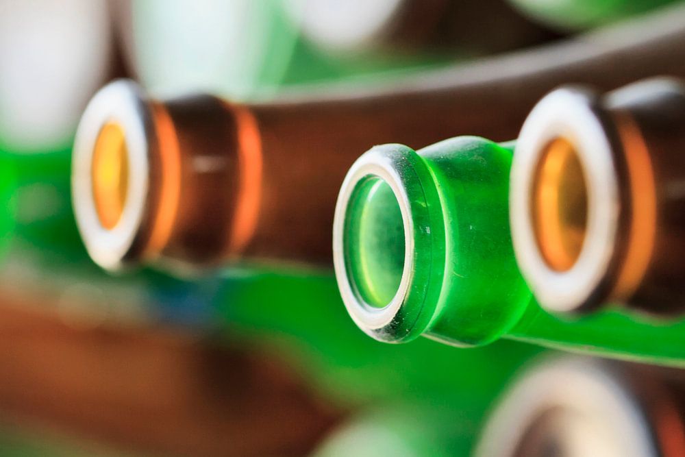 Spiel von Licht, Reflexion und Transparenz an einer Wand aus leeren roten und grünen Bierflaschen