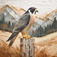 Ein Wanderfalke auf einem Holzpfahl, im Hintergrund sind ein Weizenfeld und Berge zu sehen. Kunstwerk in goldbraunen, warmen Grau- und Orangetönen.