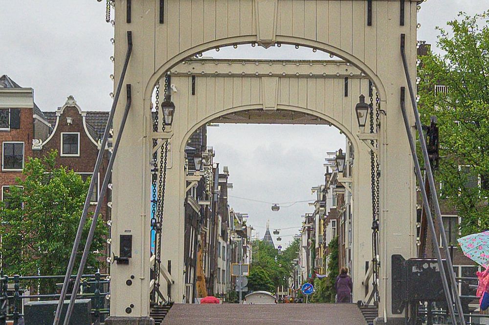 Eine junge Frau geht unter einem Regenschirm über die Skinny Bridge im verregneten Amsterdam. Dieses Werk kann in mehreren Varianten bestellt werden.